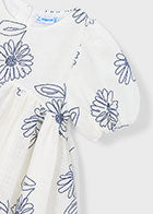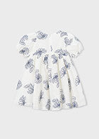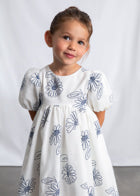 De fijne bloemenprint in zacht blauw op een frisse witte achtergrond geeft het jurkje een rustige, elegante uitstraling. De pofmouwtjes en de licht uitlopende rok zorgen voor een speelse, dromerige look waar elk meisje zich vrij in kan bewegen.
