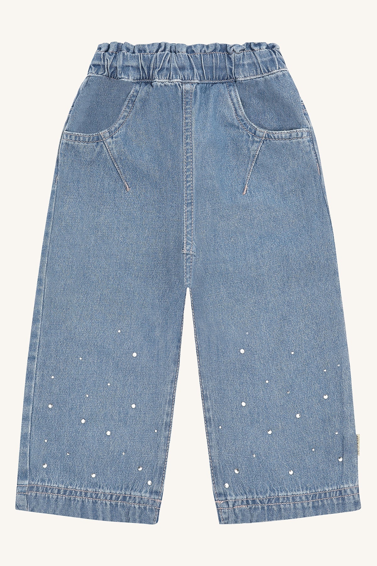 De pareltjes onderaan de pijpen geven een subtiele glans, terwijl de wijde pasvorm en elastische taille zorgen voor heerlijk draagcomfort. Gemaakt uit een zachte, soepele denim die makkelijk beweegt — perfect voor elke dag.