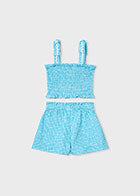 Het smock topje met fijne bandjes zit heerlijk comfortabel en past zich mooi aan, terwijl het bijpassende shortje met speelse zakjes en witte bies zorgt voor een extra cute touch.