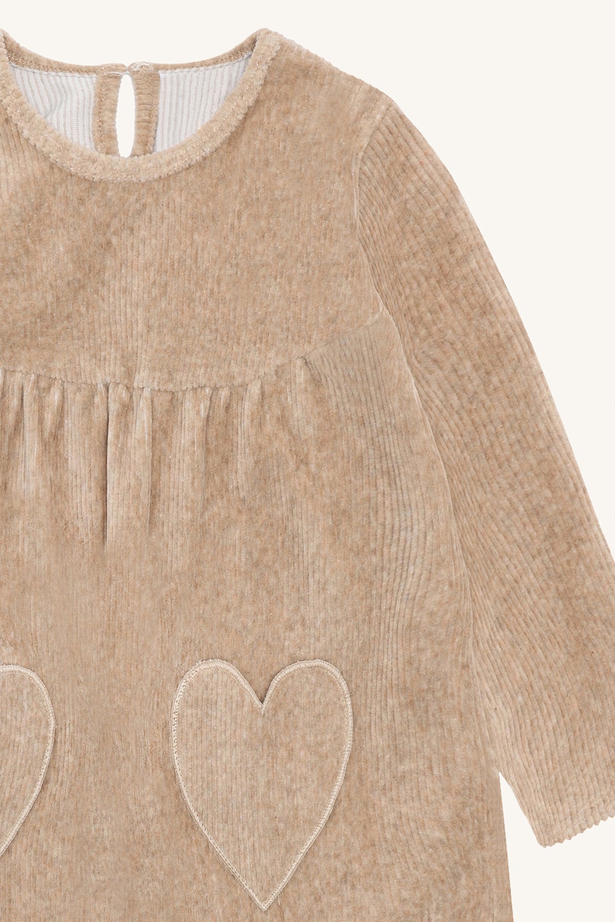 Zacht, lief en perfect voor elke gelegenheid — dit beige fluwelen jurkje van Hust & Claire is pure zachtheid voor kleine prinsesjes.