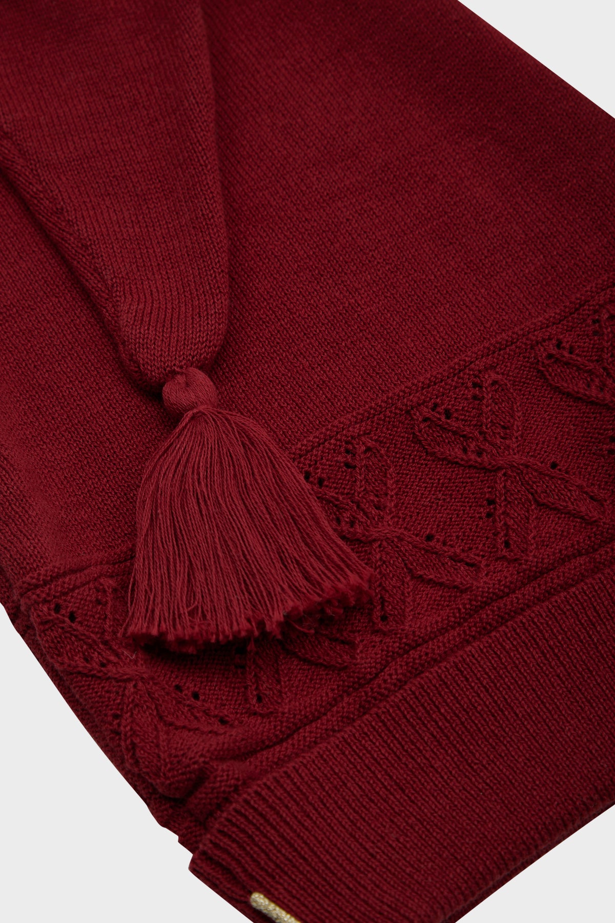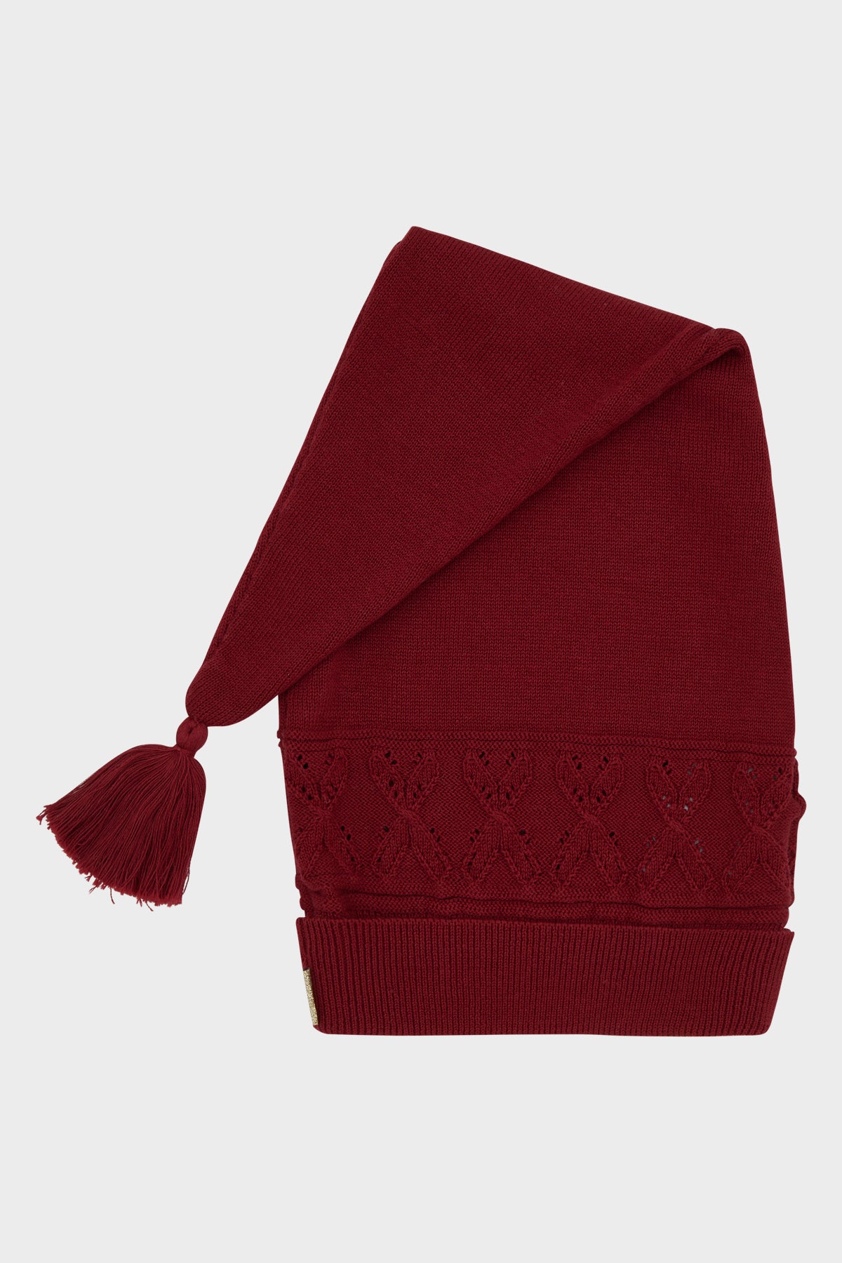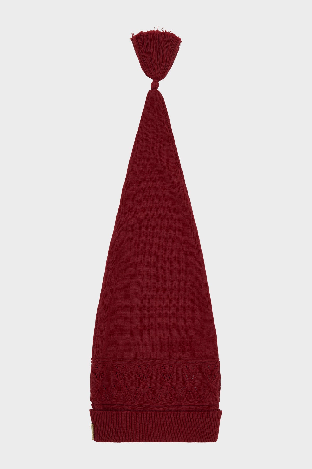 Gebreide kerstmuts van zacht katoen met een mooi pointellepatroon. De muts heeft een omgevouwen rand en een pompom.