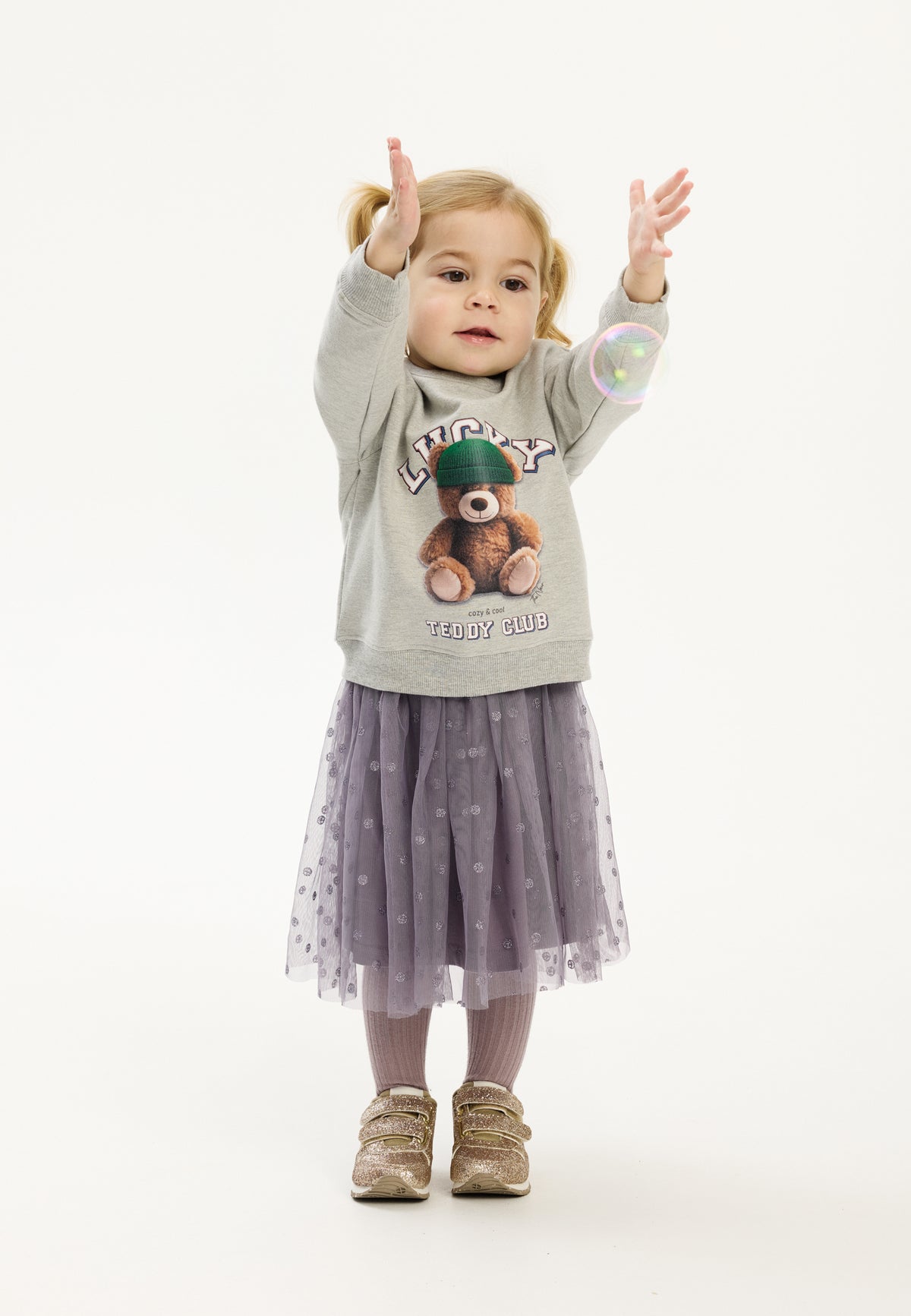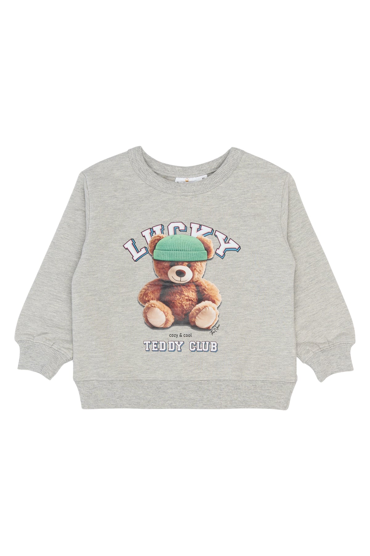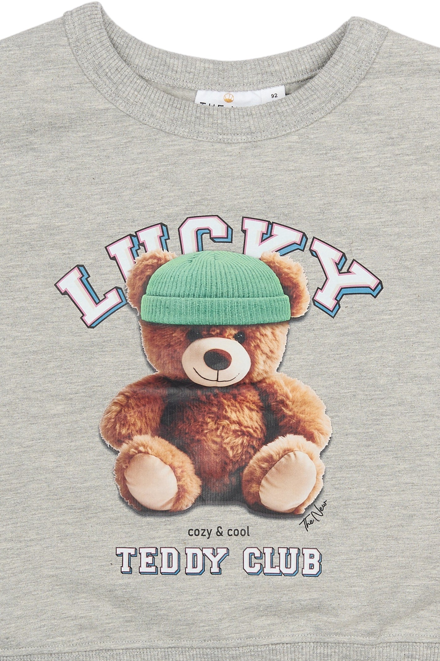 Word lid van de Teddy Club met deze cozy & cool sweater van The New Siblings! 🐻 De zachte grijze melange trui heeft een stoere teddybeerprint met groene beanie en de tekst Lucky Teddy Club. Een echte blikvanger die comfort en fun combineert.