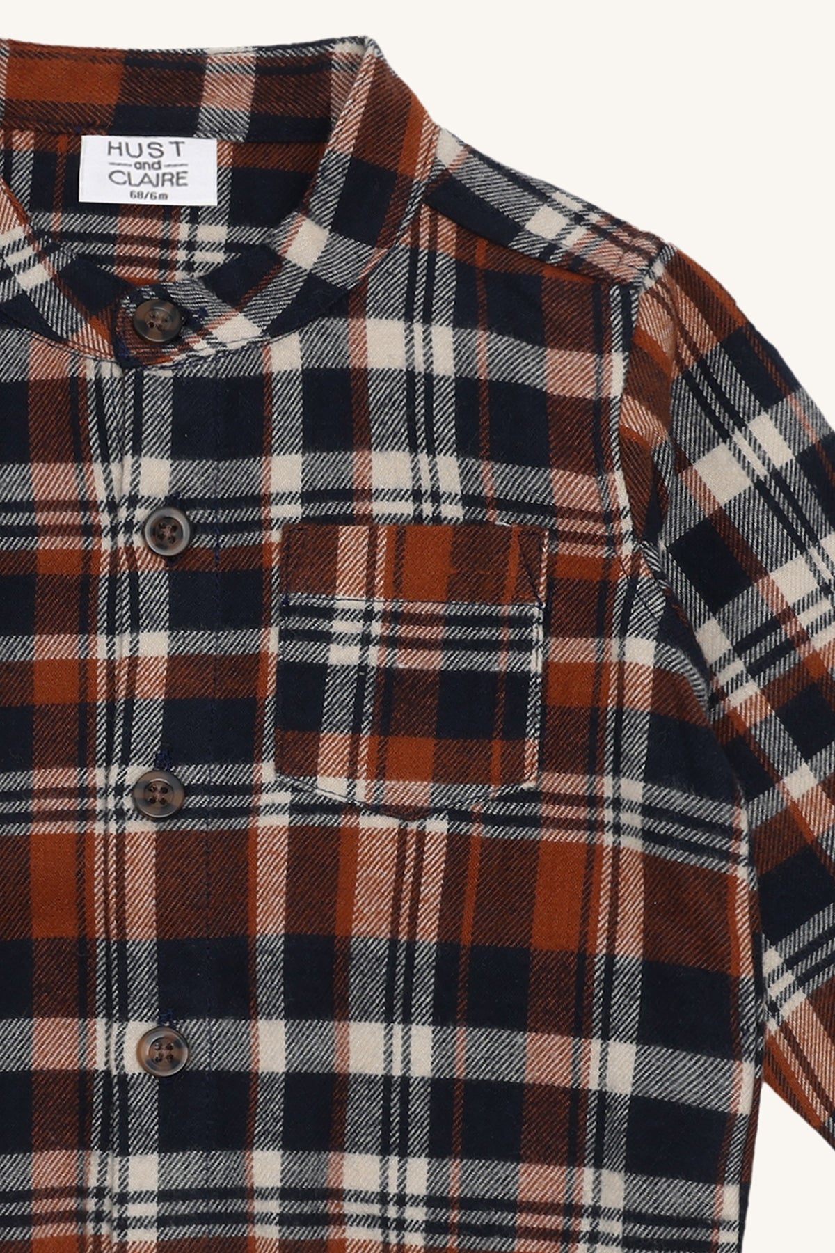 De warme ruitjes in roest, navy en ecru geven een echte herfstvibe, terwijl de zachte onderkant in jersey zorgt dat het hemdje mooi blijft zitten.