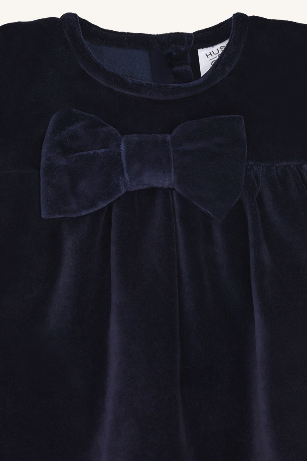 Een tijdloos jurkje dat elegantie en zachtheid uitstraalt — dit fluwelen feestjurkje van Hust & Claire is een echte klassieker voor de eindejaarsfeesten. De diepe marineblauwe kleur geeft een stijlvolle uitstraling, terwijl de grote fluwelen strik op de borst zorgt voor een schattige, feestelijke touch.
